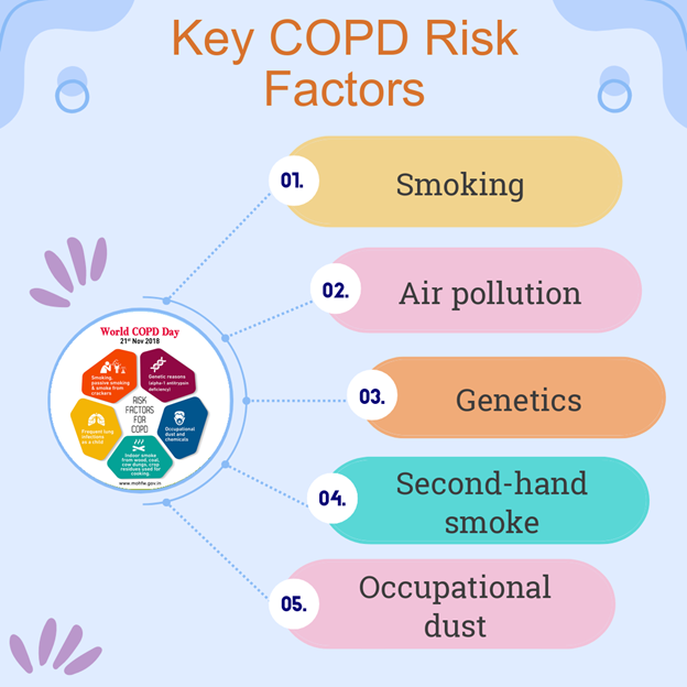 It’s important to know the copd risk factors like smoking and pollution. Quitting smoking helps relieve stress on the lungs and body overall. Avoid secondhand smoke and wear masks to help in bad air quality. Regular exercise and a healthy diet can keep lungs working well. Reduce exposure to dust and fumes at work to protect your health.
